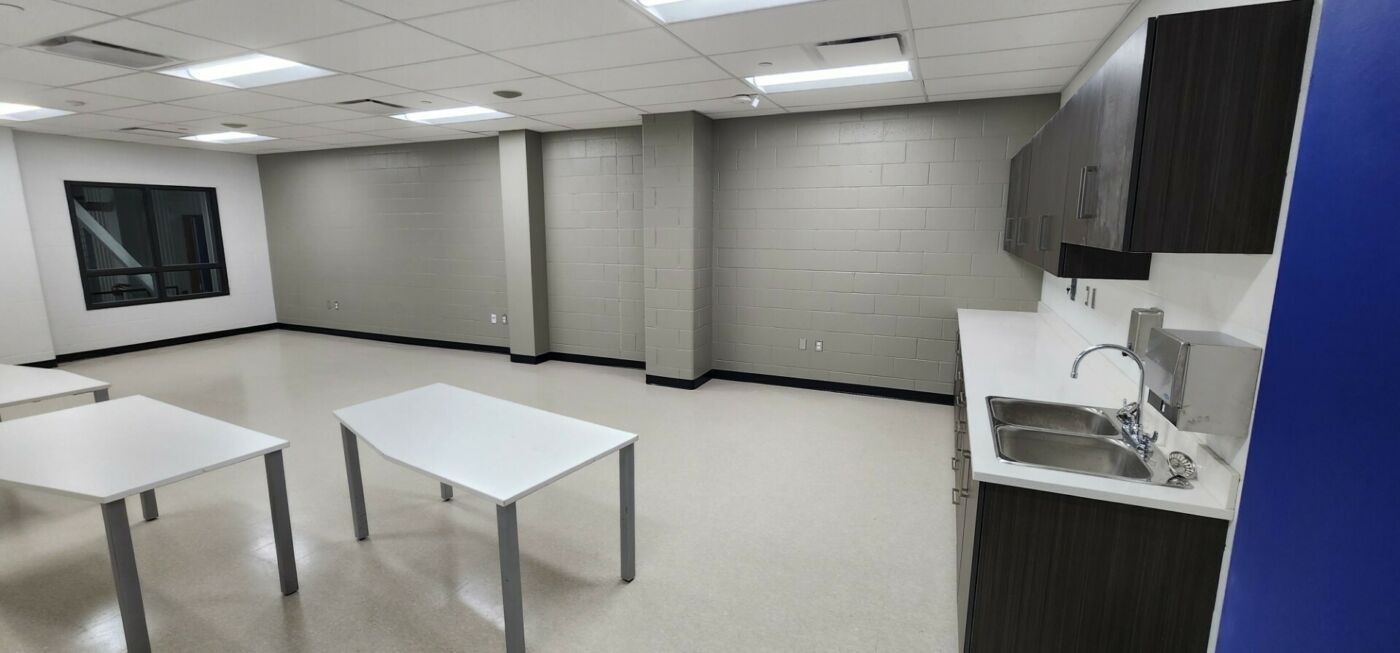 Welcome to our art room, where creativity knows no bounds! This is a 695 square foot room with a sink and cabinets that is primarily used for arts and crafting activities. It can also be used as a meeting space.