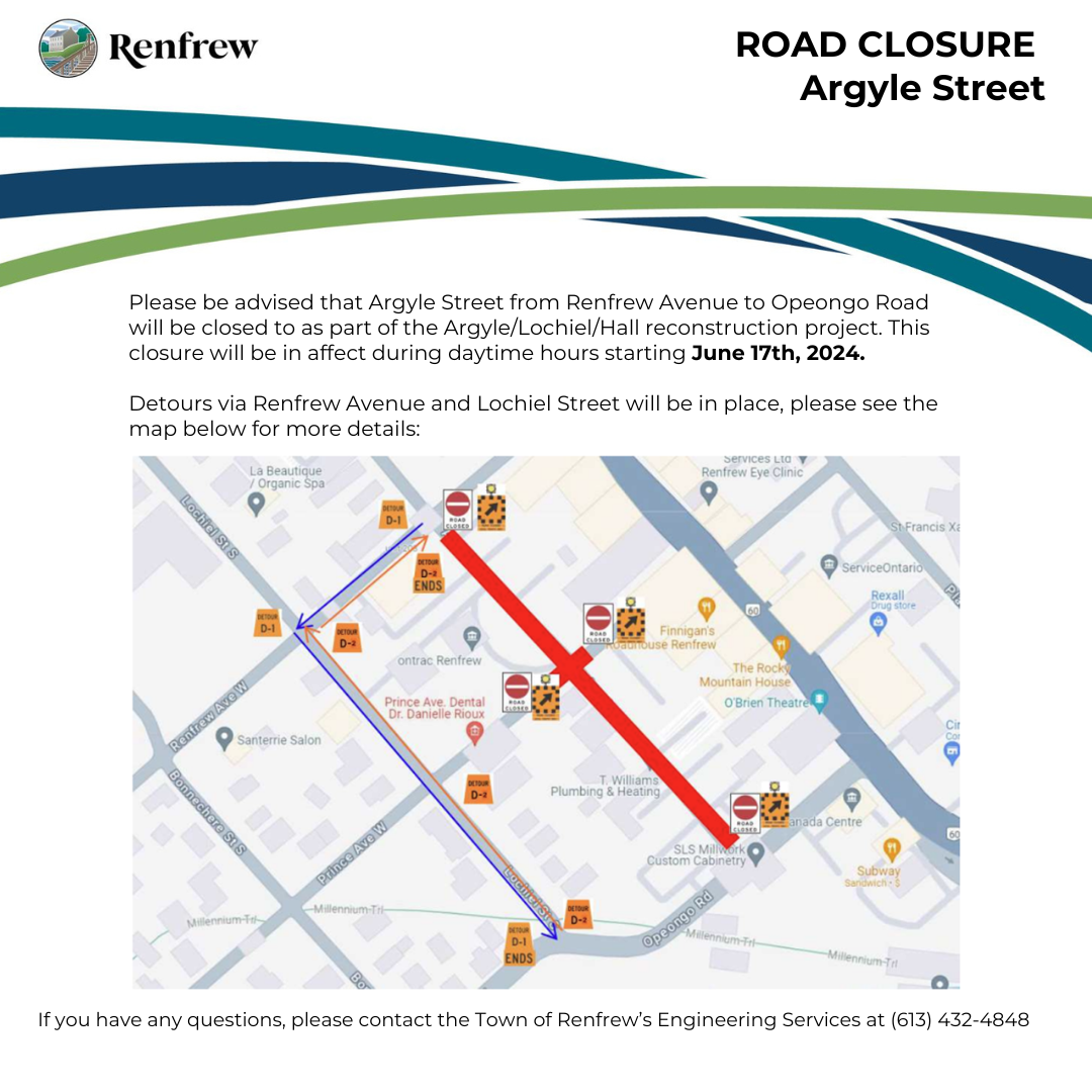 June 14, 2024 Argyle Street Road Closure Notice: Please be advised that Argyle Street from Renfrew Avenue to Opeongo Road will be closed.