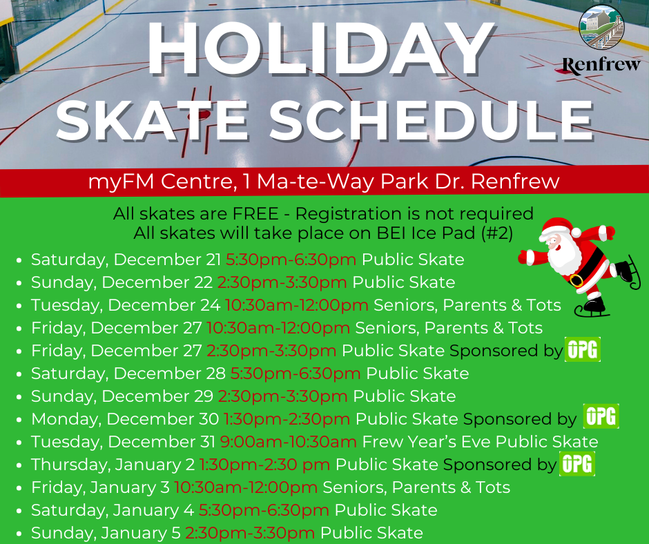 December 21, 2024 Holiday Skate Schedule FREE Public Skates and Senior, Parent & Tot Skates over the Holiday Break!