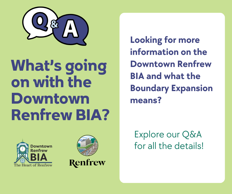 January 09, 2025 Downtown Renfrew BIA Boundary Expansion Q&A Looking for more info on the Downtown BIA Boundary Expansion? Explore our Q & A for all the details!