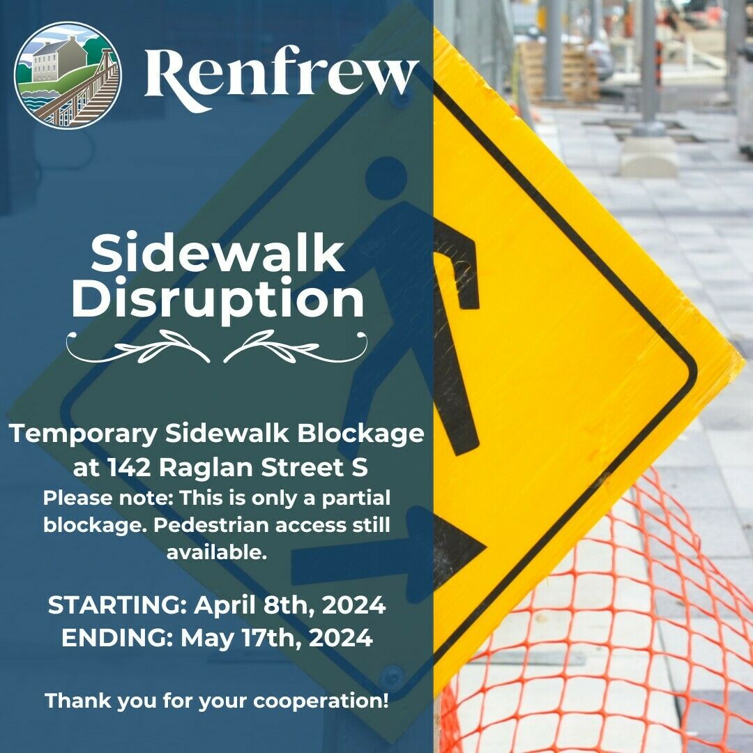 April 09, 2024 PUBLIC NOTICE: Temporary sidewalk blockage There will be a temporary sidewalk blockage at 142 Raglan Street South starting April 8th ending May 17th
